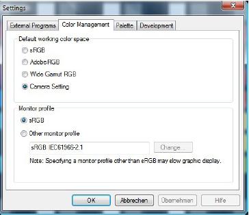 Za delovni postopek barvnega upravljanja morate nastaviti le nekaj nastavitev. V meniju izberite Settings [Nastavitve] in in odprite zavihek Color management [Upravljanje barv]. V zgornjem delu lahko izberete delovni barvni prostor: če izberete sRGB, Adobe RGB ali Wide Gamut RGB, bo IDC SR vedno objavil slike v izbranem barvnem prostoru. Če izberete Camera settings [Nastavitve fotoaparata], bo IDC SR uporabil barvni prostor, ki je izbran v fotoaparatu. To je lahko barvni prostor sRGB ali Adobe RGB.